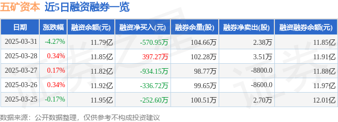 五矿本钱融资融券新闻显示,融资方面,当日融资买入5505.85万元,融资了偿6076.8万元,融资净了偿570.95万元。融券方面,融券卖出2.45万股,融券了偿700.0股,融券余量104.66万股,融券余额587.14万元。融资融券余额11.85亿元。