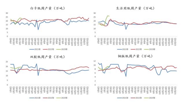 分纸种来看,截至2023年2月23日,白卡周产量23.6万吨(环比-2%),糊口用纸周产量26.38万吨(环比-2.2%),小幅减产;双胶纸周产量19.3万吨(环比+0.16%),铜版纸周产量9.3万吨(环比持平),文明纸产量较为平静。