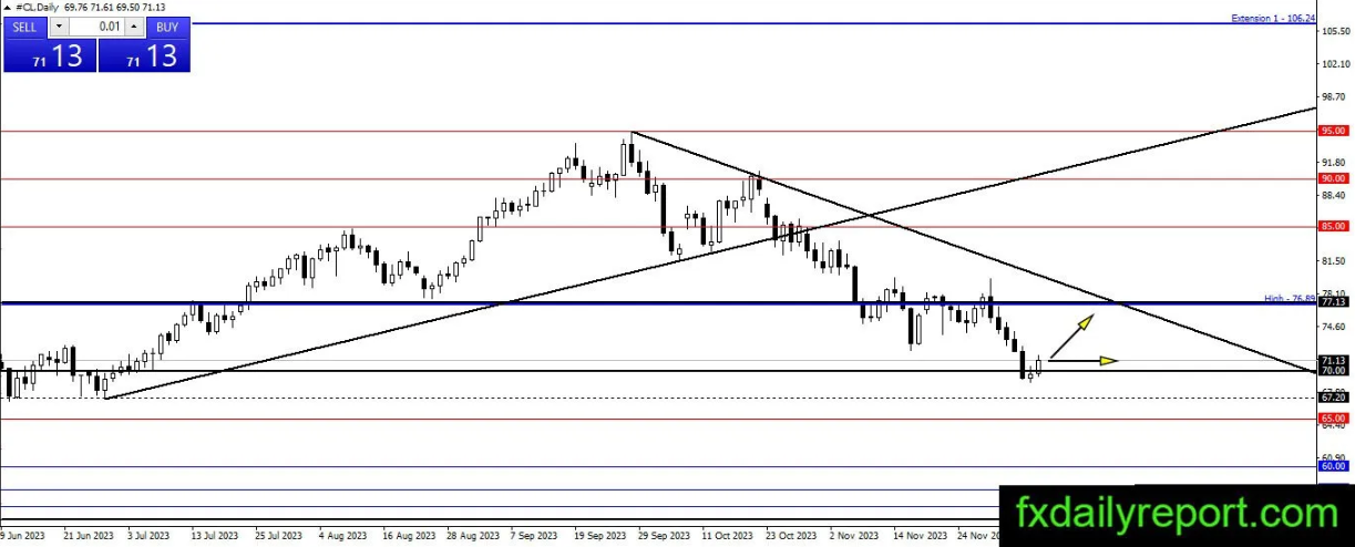 原油价钱一道阅历了从77.13美元下跌到70.00美元的阶段性削弱,目前显示出一种看涨的反响,并将测验从70.00美元的程度反弹。假使价钱或许收于77.13美元上方,那么情景能够会转为看涨。正在一段期间内,价钱有能够正在70.00美元邻近接连盘整。
