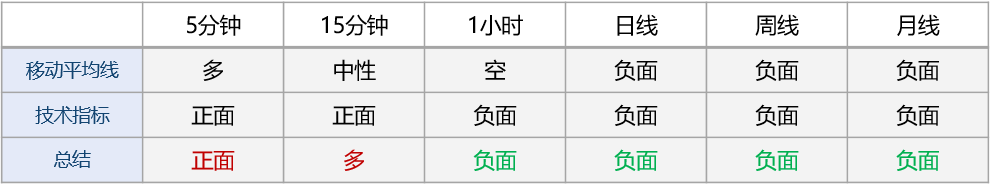 众周期技艺信号显示日内商场心情看跌:超短线小时),短中线看跌(日线,周线),长线看跌(月线)。
