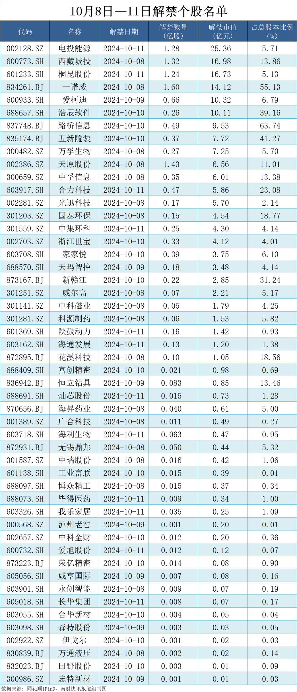 同花顺iFinD数据显示,以最新收盘价筹算,10月8日至11日共有约181.77亿元市值解禁,位列前五的分袂是电投能源25.36亿元、西藏城投16.98亿元、桐昆股份16.73亿元、一诺威14.12亿元、爱柯迪10.32亿元。