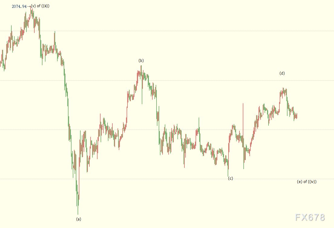 小时图上看,金价处于自1993美元开启的(e)浪阶段,(e)浪是自2075美元开启的调理((iv))浪。((iv))浪料闪现(a)(b)©(d)(e)五子浪轰动收敛楔形形状,区间重心正在1950美元相近。估计金价正在跌破1950美元后不久停止((iv))浪,并开启((v))浪走势。