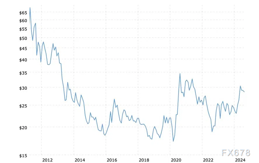500)this.width=500 align=center hspace=10 vspace=10 rel=nofollow/从2011年4月到2024年7月,银价从48.60美元跌至29.01美元,跌幅达40%。研讨到通货膨胀的影响,亏折幅度抵达57%(从67.89美元降至29.01美元)。