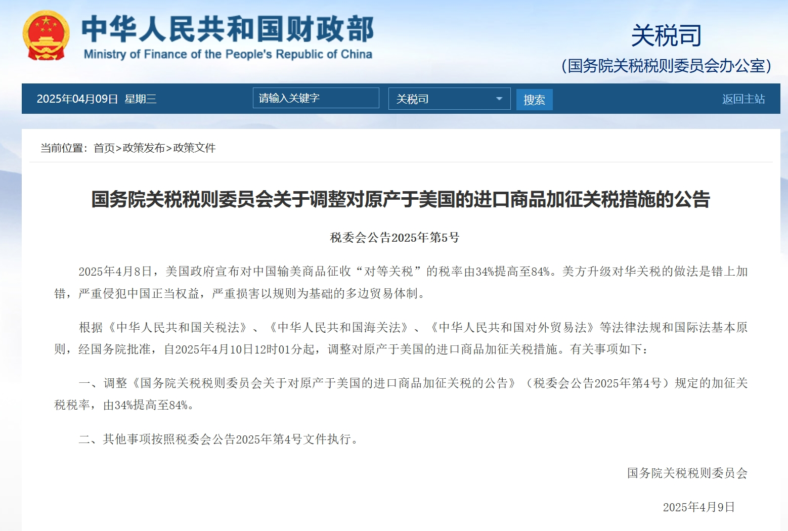 一、调剂《邦务院合税税则委员会合于对原产于美邦的进口商品加征合税的通告》(税委会通告2025年第4号)规矩的加征合税税率,由34%提升至84%。