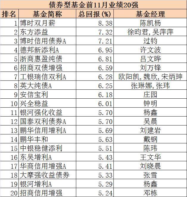 目前债券型基金事迹排名第一的是博时双月薪,前11个月总回报为8.38%。可是东方添益、博时信用债阔别以8.38%、7.32%的收益率紧跟其后,正在剩下的一个月里是否可能赶超还未可知。