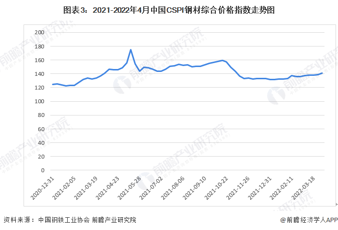 中邦钢铁工业协会数据显示,2021-2022年,中邦钢材价钱呈颠簸递增趋向,由2020年12月31日的124.52增进至2022年4月1日的140.69。此中,正在2021年5月14日增进至174.81的最高值后下手颠簸降落,但自2021年终今后,钢材价钱下手呈颠簸上升趋向,上升趋向较为稳定。