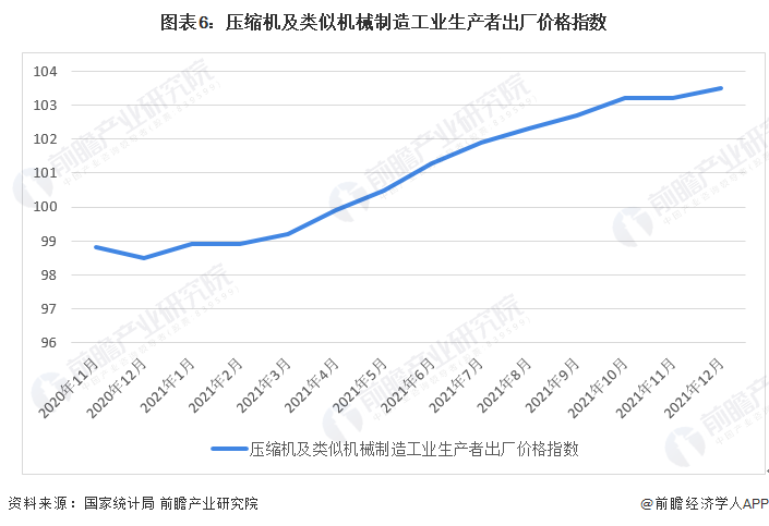 正在原资料价钱上行的压力下,我邦氛围压缩机行业价钱也映现上浮趋向。按照邦度统计局数据显示,2021年12月我邦压缩机及仿佛呆板造造工业坐蓐者出厂价钱指数为103.5,同比上涨3.5。