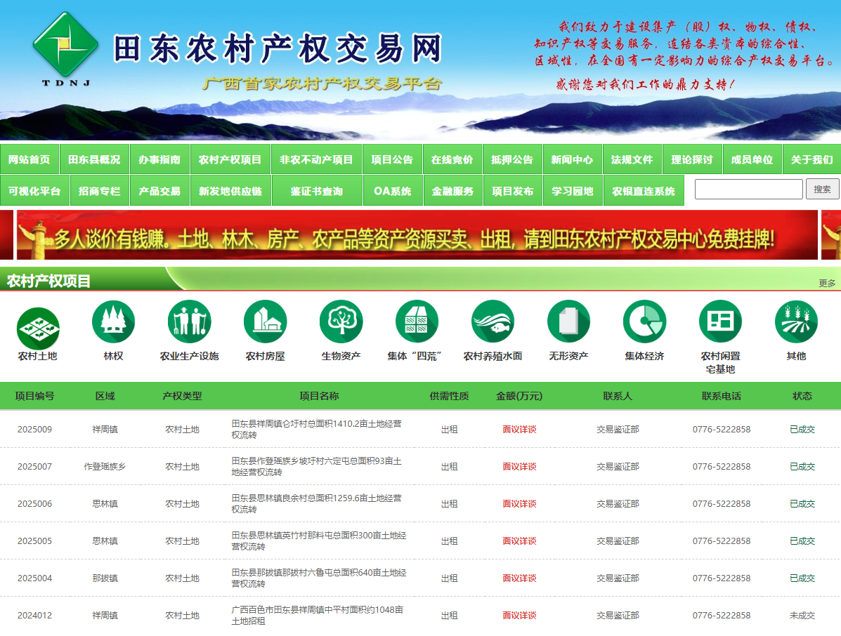 思林镇坛乐村2000亩闲置土地通过田东墟落产权来往网找到了新主人,以900元/年/亩的价钱流转给广西一家农业公司。村支书邓永彪说,网上来往不光省时省力,更令村民信服。
