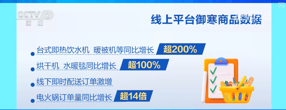 线上平台的数据显示,台式即热饮水机、暖被机等同比拉长超200%;烘干机、水暖毯同比拉长超100%。线下即时配送订单激增,电暖锅订单量同比拉长超14倍。暖锅相干商品同步热销,暖锅肉卷成交额同比提拔76%、线%、黑虎虾成交额同比拉长58.69%。毛呢大衣、羊绒衫、皮草等打扮品类成交额同比拉长均超100%。浙江义乌:取暖用品热销 追加订单客户增加