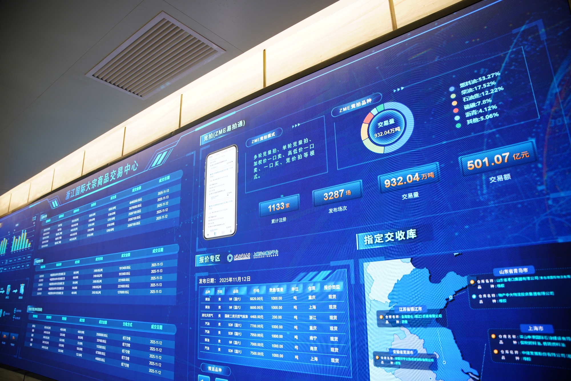 正在往还核心的大屏上,挂牌行情、产能预售行情、竞拍行情的数字无间地跳动,正在这里,时时刻刻都有大宗商品的往还爆发。