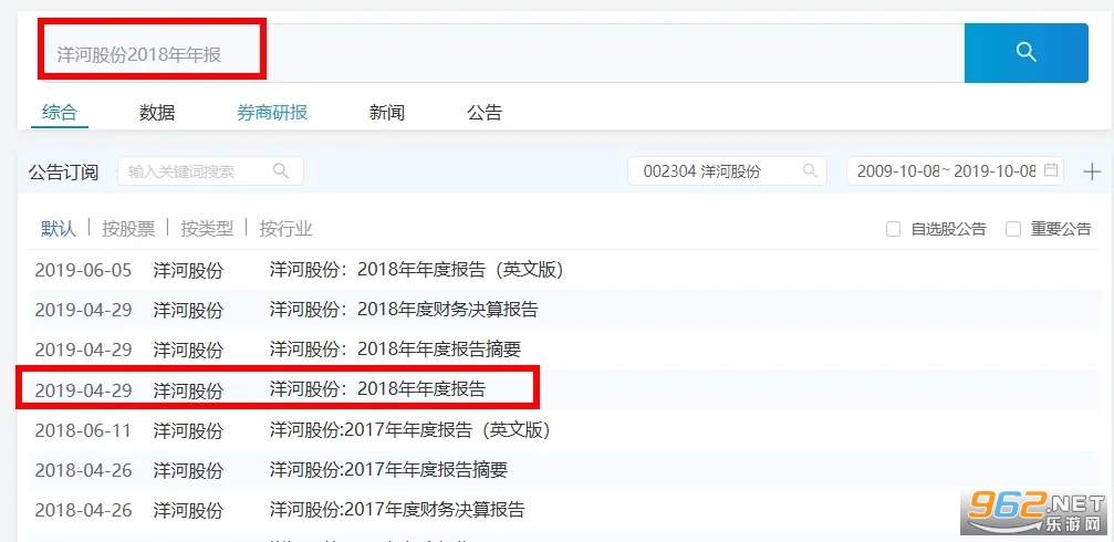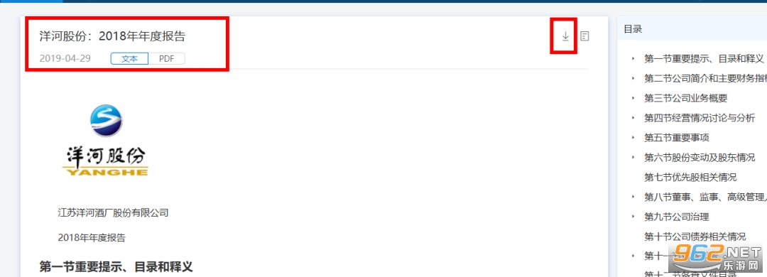 这里,咱们就能看到“洋河股份:2018年年报”了,右上角的框框点击后可能下载。