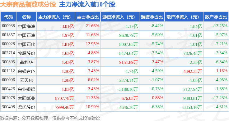 资金流向方面,大宗商品(000979)指数成份股当日主力资金净流出合计74.8亿元,逛资资金净流入合计14.36亿元,散户资金净流入合计60.44亿元。成份股资金流向详情睹下外: