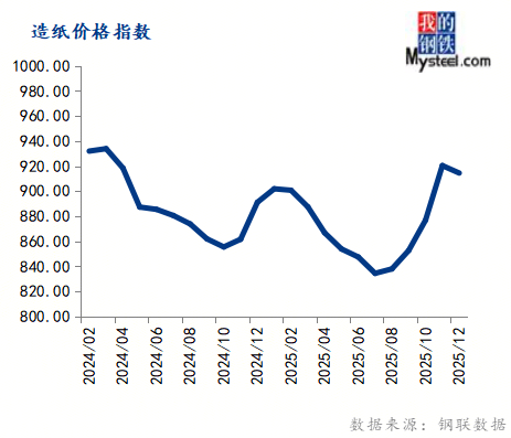 12月份制纸价钱指数为914.54,环比下跌0.65%,同比上涨2.62%。