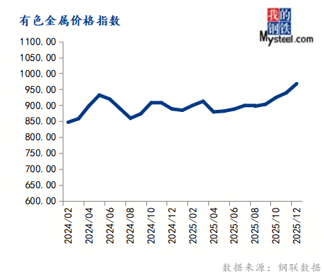 12月份有色金属价钱指数为967.51,环比上涨3.05%,同比上涨8.89%。