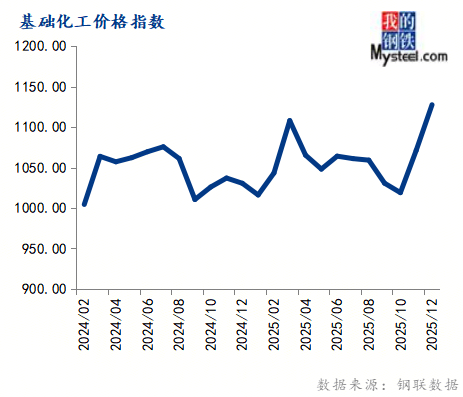 12月份根底化工价钱指数为1127.72,环比上涨5.26%,同比上涨9.42%。