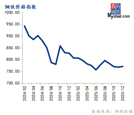 12月份钢铁价钱指数为770.31,环比上涨0.36%,同比下跌6.76%。