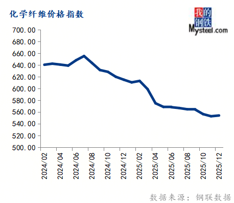 12月份化学纤维价钱指数为554.39,环比上涨0.24%,同比下跌9.90%。