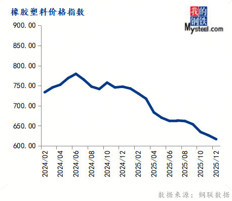 12月份橡胶塑料价钱指数为616.68,环比下跌1.55%,同比下跌17.50%。