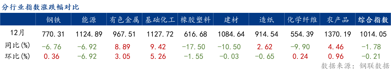 环比来看,12月份钢铁、有色金属、根底化工、化学纤维、农产物5个行业价钱指数上涨,能源、橡胶塑料、筑材、制纸4个行业价钱指数下跌。