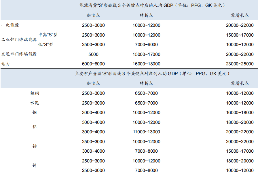 能源和重要矿产消费“S”形弧线个要害点对应的人均GDP(单元:PPG,GK美元)