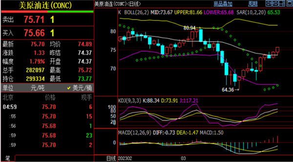 4小时图形中一眼看去布林带启齿向上,各个均线日均线交叉向上发扬,买盘强劲支柱油价。附图目标上MACD金叉,赤色柱放量上行,KDJ随机目标金叉但亲密超买区域,STO目标同步来到超买区域,周一刘铭诚看好原油遇阻回落修复目标。归纳来看,原油价值上方体贴76.7周线支柱,操作上刘铭诚倡议守候遇阻再做空,主高空筑仓,众单临盘给出提示。