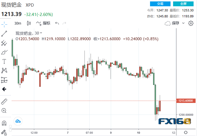 其他贵金属也纷纷下挫:现货钯金向下触及1200美元/盎司,日内跌超4%。现货白银日内跌幅超1%,最低触及22.74美元/盎司。