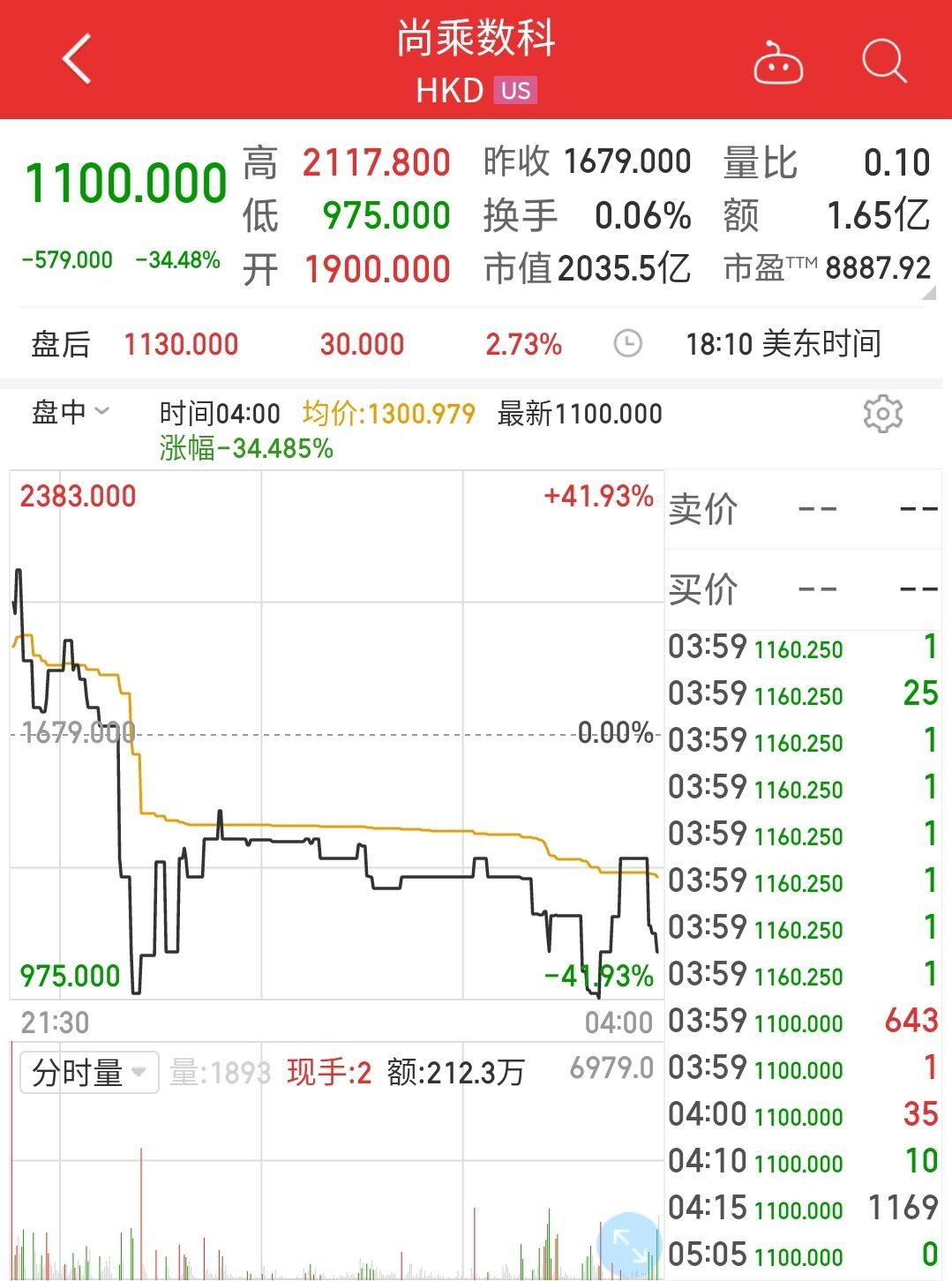 截至8月4日美股收盘,尚乘数科跌34.48%,报1100美元/股,市值2035.5亿美元。一夜之间,尚乘数科1071亿美元市值蒸发。