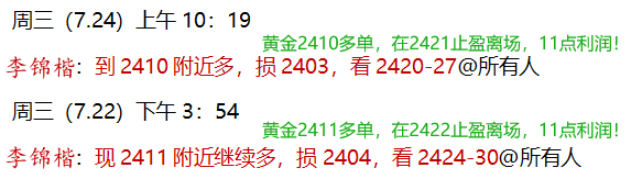 7.24 周三,黄金公然思道争持看涨不摇荡,固然日内回撤不足政策做众场所,但实盘内,一连安顿黄金2410众单,及2411众单,一概争持拿到晚间,一概正在2422止盈离场,具体成果22点利润!