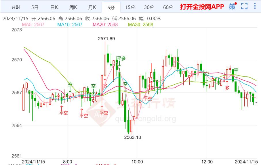 周五(11月15日)本买卖日现货黄金日内撑持振撼走势,今日开盘报2567.17美元/盎司,最高触及2571.69美元/盎司,最低触及2554.43美元/盎司,截止发稿金价报2566.57美元/盎司,涨幅0.06%。