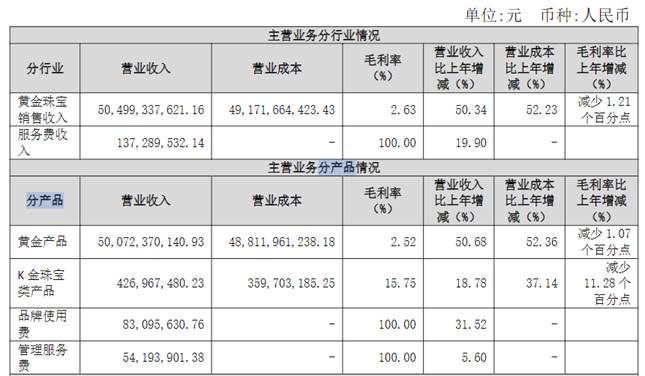 分产物来看,黄金产物营收占比最高,2021年告终贸易收入500.72亿元,延长50.68%。除了行业景心胸发动功绩延长外,2020年度受疫情等影响导致上期基数较小也是其大幅延长的出处之一。