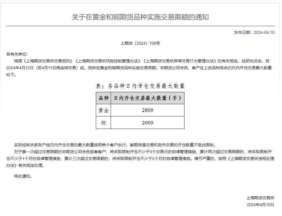黄金、铜、原油各合约正在单个来往日里买入开仓+卖出开仓的总量有控制了,不行领先相应手数。