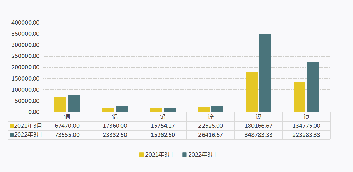 个中,铜(1#电解铜,阴极铜)、铝(A00铝锭)、铅(1#铅锭)3月份均匀贩卖代价差异为每吨73555.00元、23332.50元、15962.50元。环比,铜、铝、铅代价差异上涨2.74%、2.49%、0.31%。同比,铜、铝、铅代价差异上涨9.02%、34.40%、1.32%。