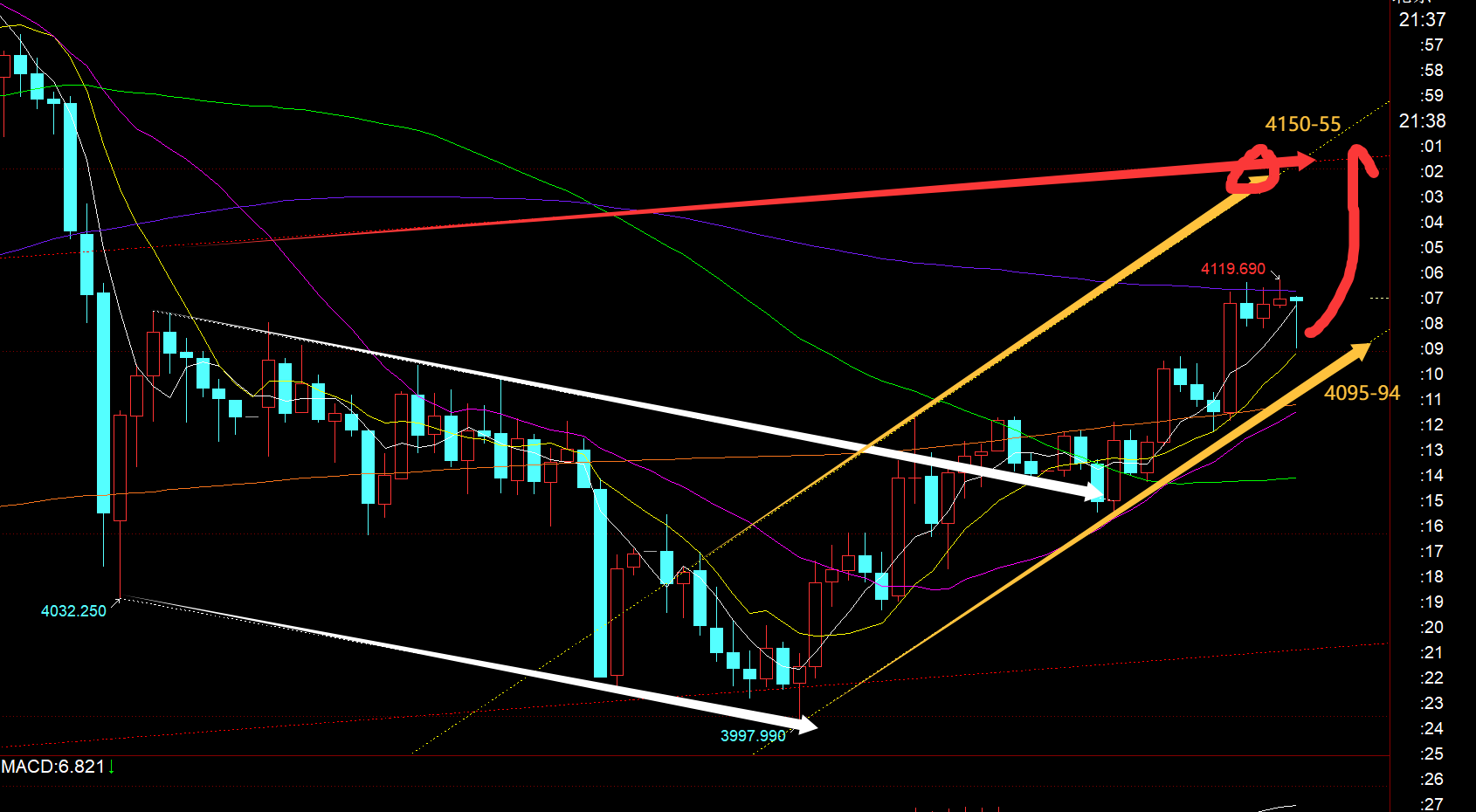 每天都会公开技术点_黄金期货开盘时间第一,黄金方面:隔夜企稳4007上探底拉升收盘,昨日依托收盘前反弹的618决裂位子4023先看涨反弹,得胜拿下10米;之后亚盘重复的冲高回落,而承压高点基础都是前一小波下跌的618决裂阻力,出现一齐惊动慢下行,但短周期macd是昭彰主要底背离,它破一次新低,则加重一次背离,是以日内夸大,这种走法很容易最终产生一波超跌反弹;同时,周视频指出4000一线通道下轨左近是收敛三角之合节,触及要试验看涨,前两日无间正在外,白昼没功夫盯盘,也无法及时画通道图,最终恰巧稳住4023-4007的趋向衍生支持点3997企稳探底拉升,开头一波超跌反弹,4000合口也只是刺穿假象;欧盘拉高,美盘就最少不是弱势,借助回踩4050上顶底支持,接连看涨,得胜抵达4070-72,此处短期通道上轨初次也假破位击穿了一次至4081,惊动行情中就很容易搞通道上下轨的破位假象,一朝防守带小很容易被误伤;