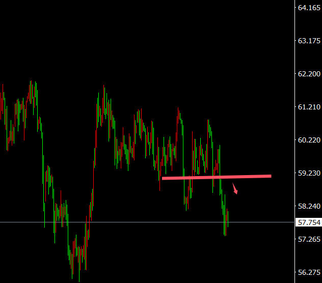 原油上周呈颤动下行,当周最高60.8,最低57.3,周线,周线看油价还将不断下跌,日线,颤动下行,综述本周操作思绪先看下行,先看57的下破环境,日内,四小时线,颤动下行,小时线,短时内颤动,综述日内操作思绪以颤动下行径主,上方闭切59