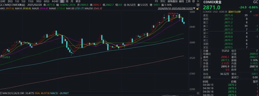 期货方面,今日COMEX黄金一度跌至近2860美元/盎司,截至记者发稿,COMEX黄金下跌0.86%,报2871美元/盎司。