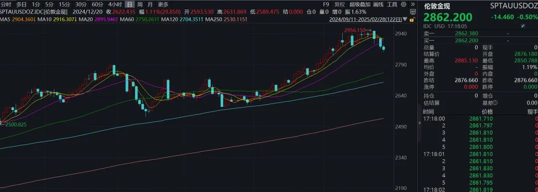2月28日,金价延续下跌,盘中伦敦金现一度跌至近2850美元/盎司,为2月6日今后初度。截至记者发稿,伦敦金现下跌0.5%,报2862.2美元/盎司。