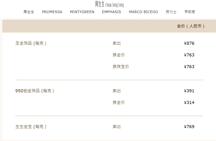 28日,周生生官网显示,足金饰品标价876元/克,25日标价为894元,3天跌18元,较20日顶峰895元跌了19元。