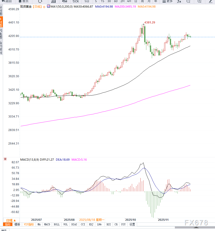 从日线周期来看,黄金价值仍旧运转正在众头组织中,合座趋向支持正在上升通道中轨—上轨之间震动上行。今朝金价宁静正在4200美元邻近,众头仍盘踞主导。