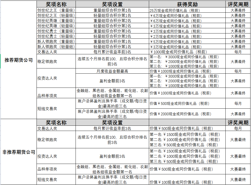 奖品奖项:本次大赛总奖金池近百万,为每一位获奖用户宣告证书,大赛奖项分为举荐期货公司和非举荐期货公司奖项以及轻量组和重量组,但应用举荐期货公司参赛,奖项更众、奖金更大。