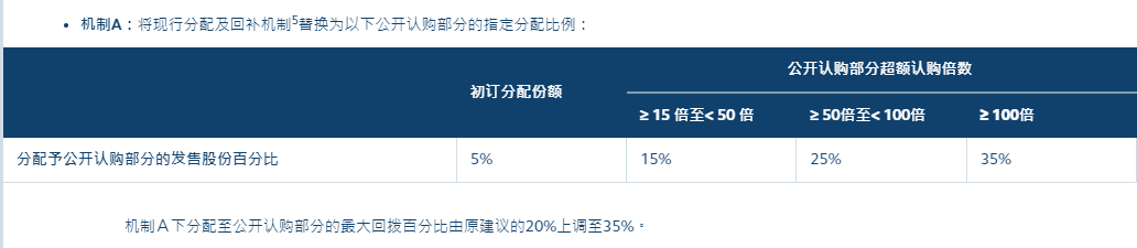 正在分拨至公然认购一面上,允诺新上市申请人正在两个机制中二选一。机制A是将现行分拨及回补机制举办调理,机制A下分拨至公然认购一面的最大回拨百分比由原提倡的20%上调至35%。