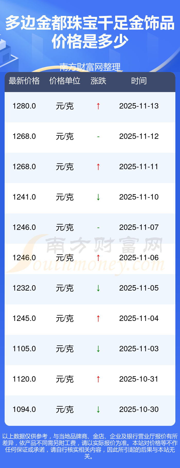 2025年11月13日众边金都珠宝千足金饰品代价查问:1280.0元/克。