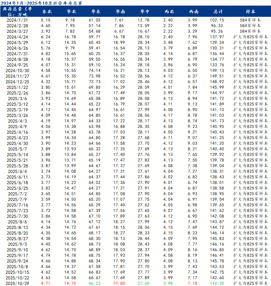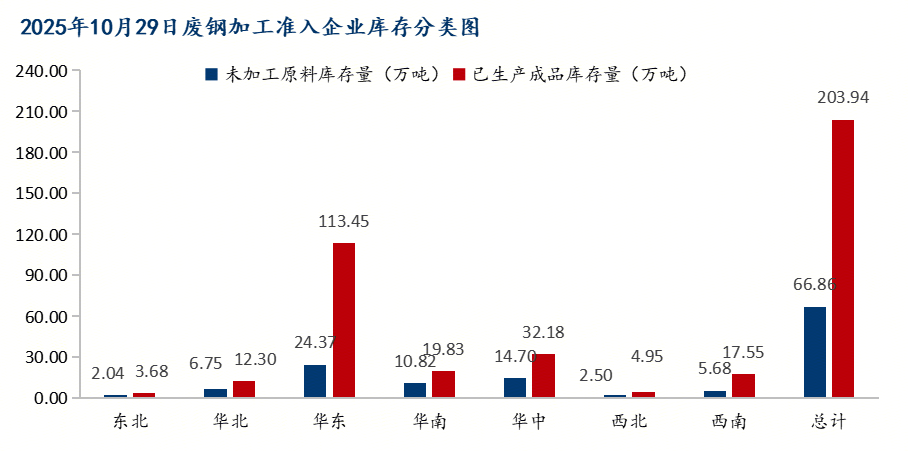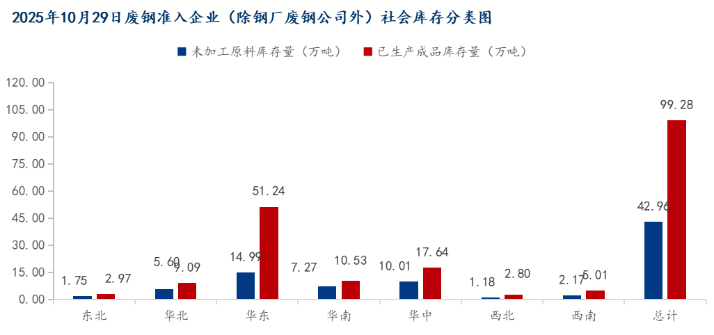 截至10月29日,Mysteel调研825家废钢铁加工准入企业,个中剔除钢厂直属废钢公司后,未加工原料及制品库存量合计142.25万吨,较上周同期库存总量降0.25%。未加工原料库存总量42.96万吨,较上周同期增0.07%,个中华北增2.46%、华北增2.56%、华东降1.18%、西南增1.17%、华南华中华北基础持平;已临蓐制品库存总量99.28万吨,较上周同期降0.39%,个中东北增1.37%、华北降0.22%、华东降0.50%、华南增1.10%、华中降1.34%、西北降0.36%、西南降0.28%。