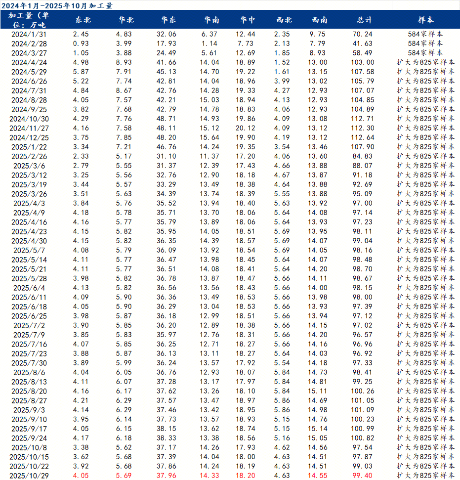 截至10月29日,Mysteel调研825家废钢铁加工准入企业,未加工原料合计66.86万吨,较上周降0.38%。个中:东北增1.60%、华北增2.12%、华东降1.00%、华南降1.37%、西南降0.53%、华中和西北基础持平;已加工制品合计203.94万吨,较上周降0.70%。个中:东北增1.94%、华北降0.16%、华东降0.34%、华南降1.02%、华中降3.07%、西北降0.40%,西南增0.90%;合计270.80万吨,较上周降0.62%。