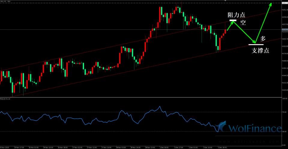 但金价很快受到逢低买盘支撑,纽约期货交易所周二(12月2日),现货黄金跌幅约0.36%,交投于4219美元/盎司左近,金价上日触及六周高位(4232.43美元)后正在周二亚洲早盘小跌,金价一度跌至4200合口左近,因投资者收获完结,同时恭候症结经济数据,以寻找降息线索。但金价很速受到逢低买盘支持,认识师指出,近期的地缘政事转机,加上对美邦钱银计谋转向宽松的预期升温,黄金估计仍将展示出韧性。目前市集已计入极高的美联储12月降息概率,抵达88%。这看待黄金的进一步上涨至合首要,由于利率低落凡是意味着持有黄金的机遇本钱低落,从而利好金价。黄金本领认识仍呈踊跃态势,金价目前仍守住正在4200美元这一首要合口。若价值或许打破下图所示样子,上涨动能希望进一步巩固。受地缘政事危险、美联储鸽派预期及通胀对冲买盘激动,黄金他日阻力途径较小的偏向仍趋势上行。思虑到方今地缘危险程度及特朗普合于美联储鸽派态度的后相,估计这些身分将连续支持金价走高。方今黄金下一阻力位看向4300美元合口。