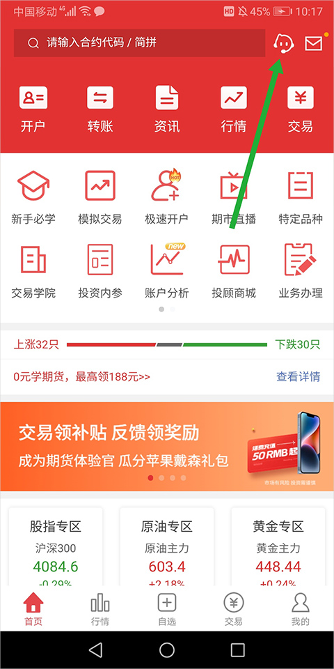 绑定银行卡是要分别分歧银行的,分歧银行的绑定形式分歧,用户能够进入安全期货app首页点击右上角的客服图标(下图绿色箭头所指)