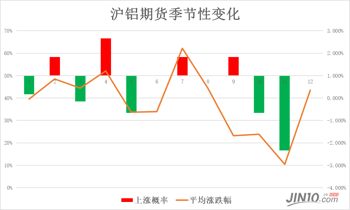 从图4可能看出,一年中沪铝价值上涨概率超越50%的唯有4个月,此中概率最高的为4月的67%。7月均匀涨跌幅最高,达2.2%。而下跌最彰彰确当属10月、11月;对待11月份而言,12年中有10年都是下跌的,下跌概率高达83%。