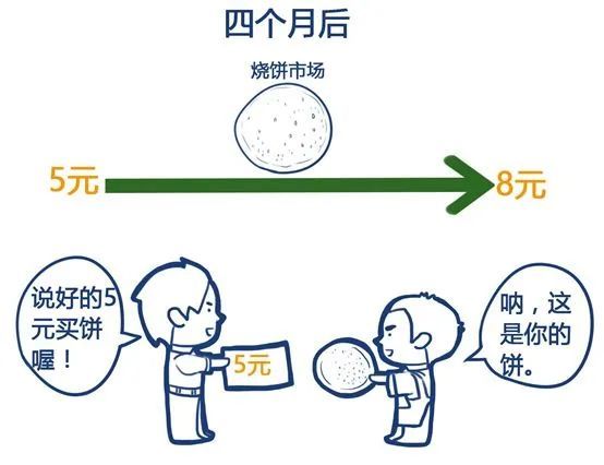 假设四个月后,市情上的烧饼涨到8块钱,你用5块钱的价钱买入,那就算赚了3块。