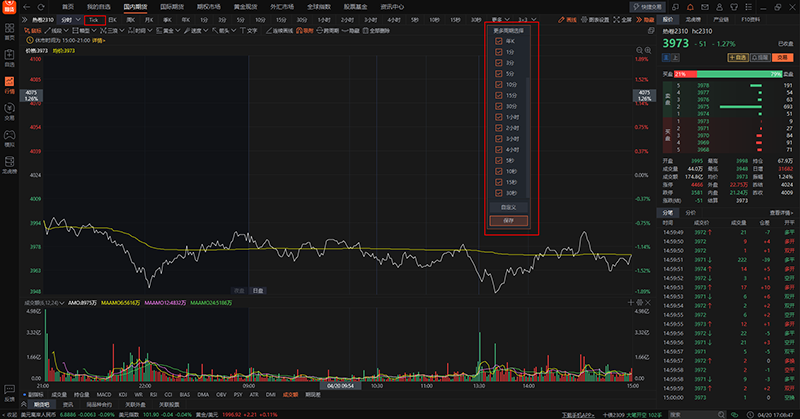 邦内期货新增tick行情和秒级K线行情。您可正在期货详情页的周期选项中点击“tick”按钮查看tick行情,点击“更众”按钮抉择和查看5秒、10秒、15秒、30秒K线行情。