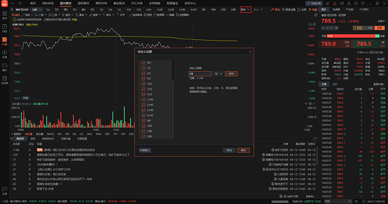 PC端新增自界说周期效用,救援对邦内期货周期举办自界说设立。您可正在期货详情页的周期选项中单击“更众”,不才拉列外中点击“自界说”按钮进入自界说周期设立弹窗设立您需求的K线周期。