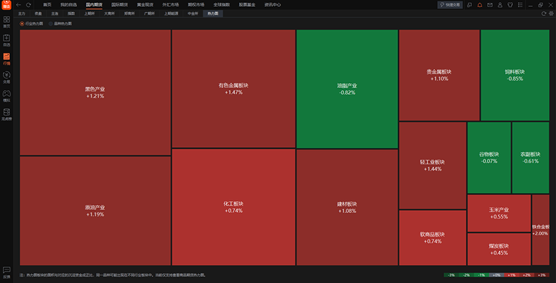 新增热力求效用,救援查看行业及种类热力求。热力求板块面积与重淀资金数额成正比,重淀资金数额越大,则对应板块的面积越大。板块颜色与对应的涨跌幅联系,涨跌幅度越大,则对应板块的颜色越深,的确颜色与涨跌幅的对应干系可通过热力求右下角的颜色标尺查看。